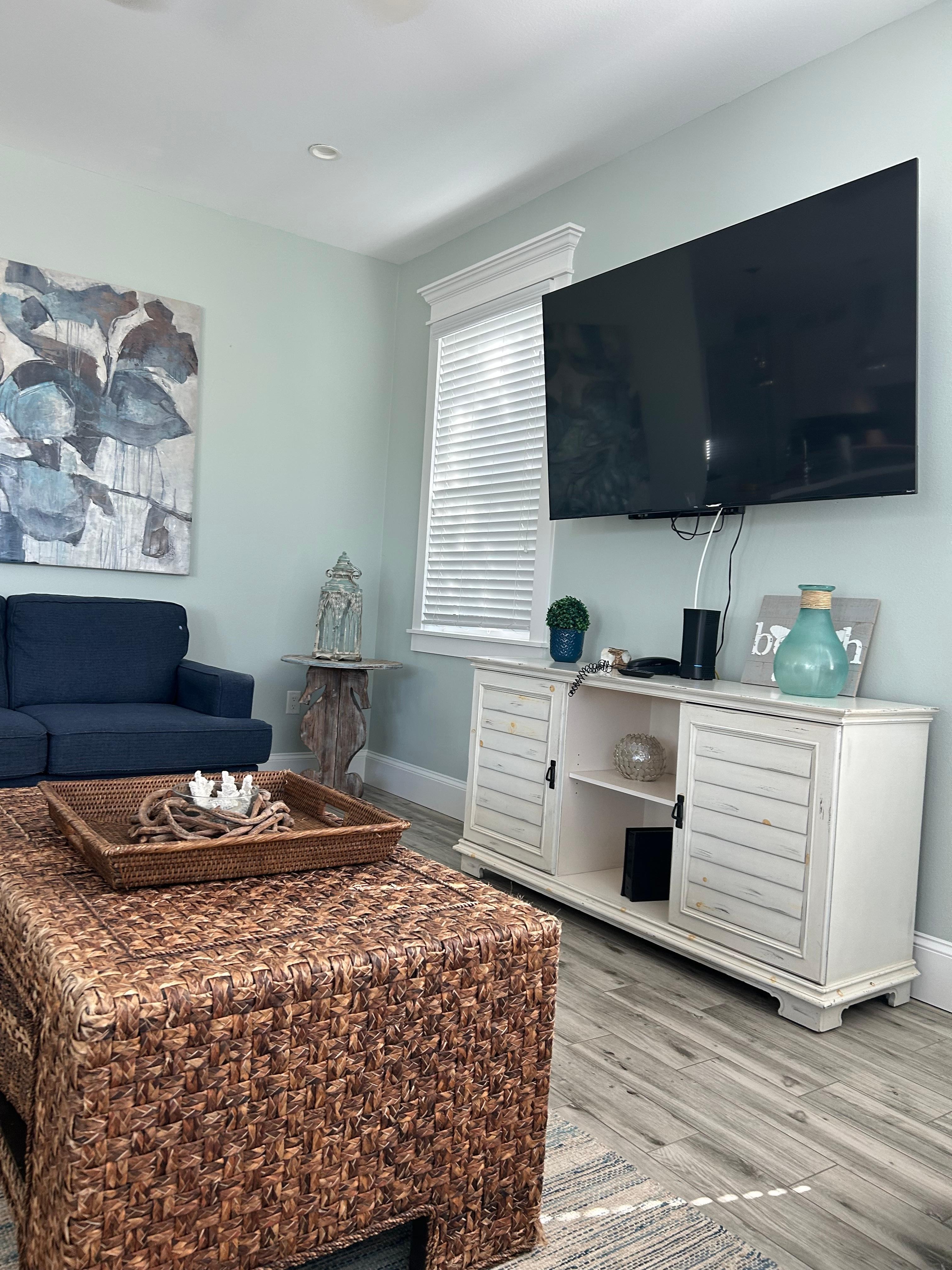 Step inside and be greeted by coastal elegance and modern comfort. The open concept living area features plush sofas, a large TV, and natural hues of sea blue and sand, creating a serene atmosphere. The fully equipped kitchen shines with upscale appliances, sleek countertops, and island seating perfect for casual breakfasts. Gather around the dining table under a decorative chandelier for shared meals, laughter, and panoramic treetop views that capture the spirit of Anna Maria Island.