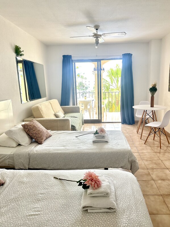 Bright and cozy studio located on the 6th floor with an elevator, it has a living room with satellite TV, a double sofa, a fully equipped kitchenette, a bedroom area with 2 single beds, a bathroom and a balcony with a table and chairs to enjoy the ocean views.