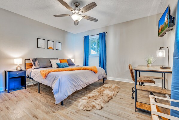 ☀ Bedroom features a cozy King-sized bed