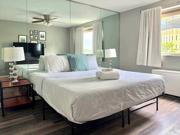 This spacious fifth-floor condo offers breathtaking views of the city skyline. The quiet residential condominium building provides a peaceful retreat while being close to vibrant restaurants and bars. With free cable and WiFi, you can stay connected while enjoying the comforts of home.