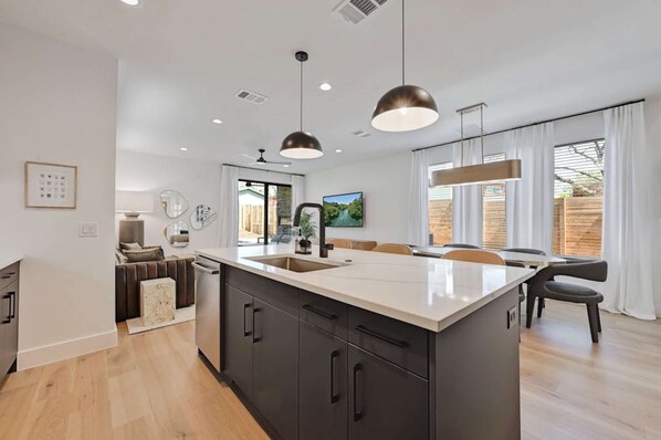 Designed for easy group stays, this chic, multi-level townhouse features 5 bedrooms and 4 bathrooms, with open-concept living and plenty of indoor/outdoor hangout space. The living room offers a smart TV and opens to a side patio where you can relax beside the private 4-ft-deep pool. The modern kitchen is fully equipped and includes a Keurig, pantry storage, and an island with seating for 3; the adjacent dining area seats 6 for shared meals.