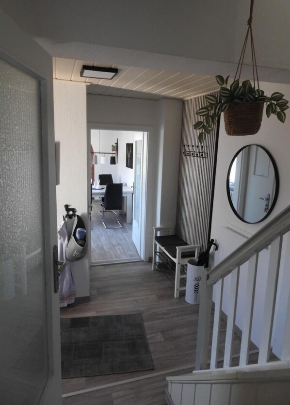 Upstairs in the attic, guests will find a second bedroom with two single beds and its own TV, plus a guest bathroom with toilet and washbasin. Whether you're traveling with children, friends, or pets, the home is well suited for relaxed and flexible stays.