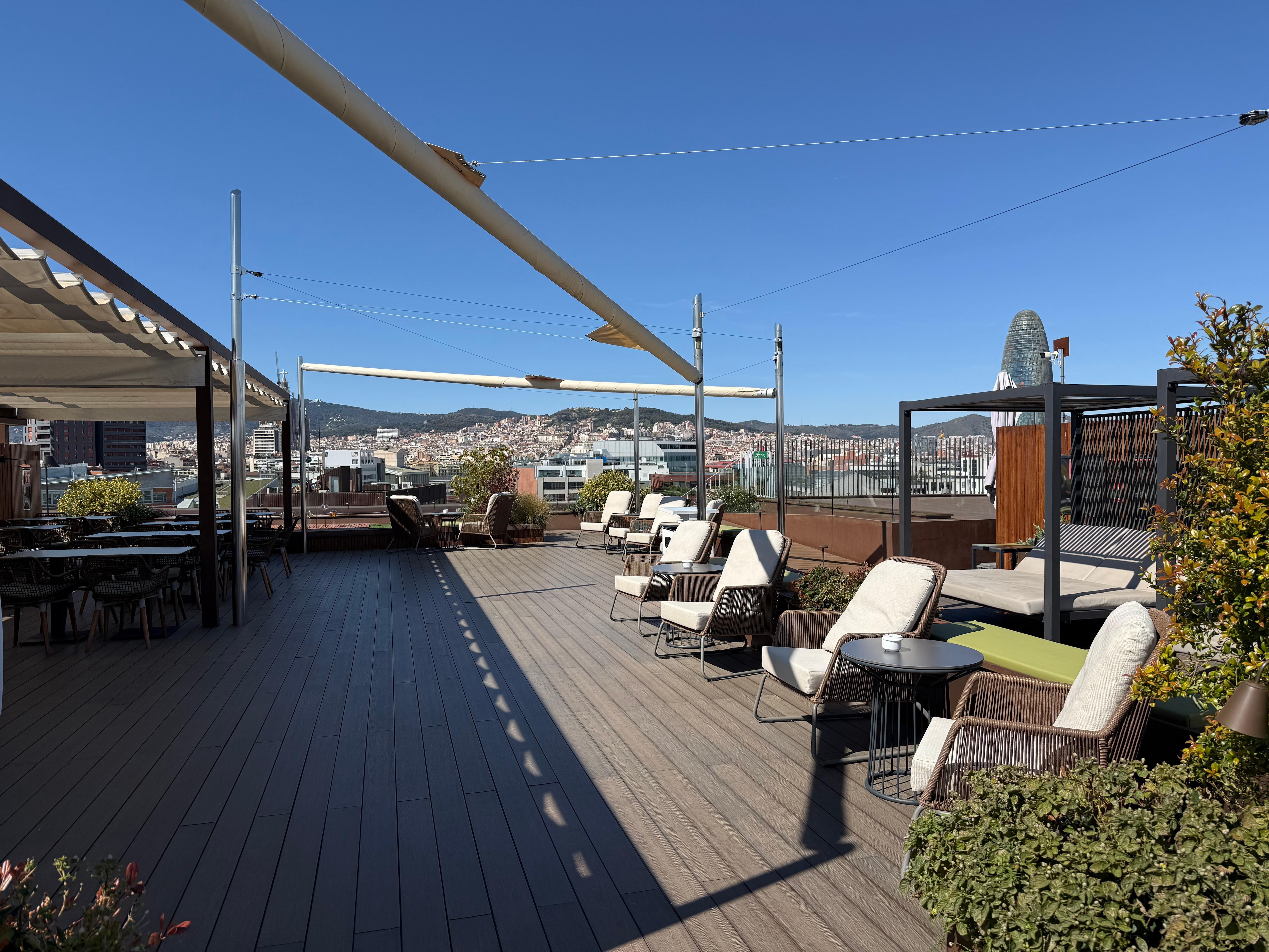 Absolutely stunning hotel! On arrival they showed me my room although it was nice it had two single beds together (which I can not stand) I went to ask reception if I could change rooms and they provided me with a stunning larger room. The staff are very accommodating at both the reception and rooftop bar. The room itself was clean and very spacious, nice tv, wardrobe and all amenities you would need. The star of this hotel would definitely be the rooftop bar and restaurant with panoramic views of Barcelona and a nice modern style to the decor. The area surrounding the hotel provide many restaurants, bars and cafes. As this was a solo trip I did feel safe walking around both the area and hotel alone at night. The hotel also has a spa/ swimming pool, the swimming pool is on the smaller size and can feel a little crowded when there’s 3 or more people. Overall great stay for the 4 nights I was there!