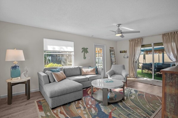 Step inside to discover 1,538 square feet of bright, open-concept living. The large kitchen features Corian countertops, stainless steel appliances, a single and drip coffee maker, and is fully stocked with cookware, utensils, bar tools, and prep supplies. Enjoy meals at the cozy dining area or take them outside to the screened lanai.