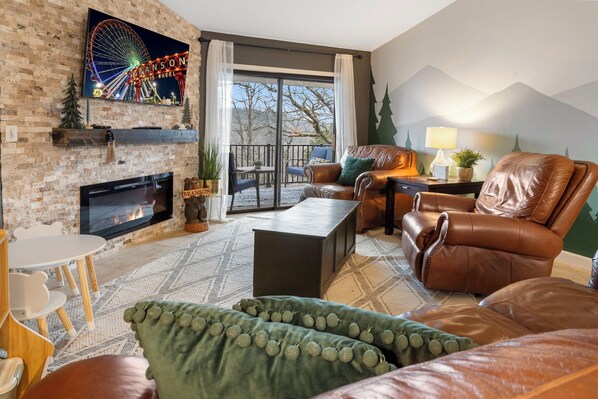 Located in the highly desired Pointe Royale Resort Community, this newly renovated with Quartz counters throughout, fresh paint, mural by local artist and high end finishes throughout boasts of 2 bedrooms with double Kings, 2 bathroom condo boasts of privacy tucked away in the trees on lake Taneycomo with a view of the lake and mountain view and no neighbors behind, yet so close to the action. The clubhouse is walking distance, less than 5 min all flat walking, and less than 10 min to everything Branson has to offer. The view of the lake is best seen in the winter months, during the summer you'll feel like you're tucked away in the trees. The soaring ceilings highlight the view and space and with extra privacy of having no neighbors above you. Since this is a top floor unit, there are approx. 15 stairs to get to the front door. The space has just been tastefully decorated to make you feel like you are truly on vacation. Master bedroom has a super comfortable king size bed, large walk in shower and balcony that leads to the amazing view. Secondary bedroom has King size bed. Both bedrooms have blackout curtains for ultimate relaxation. Couch has pull out memory foam queen, and a pack n play, sleeping a total of 7. Both bedrooms and living room have Smart TVs and cable. The condo is stocked with family friendly amenities including kids table and chairs, toys, coloring books and markers, a pack and play, highchair, and toddler air mattress. Large covered porch has seating for 6 to enjoy the amazing view with a cup of coffee, glass of wine or a meal. Kitchen is fully stocked including kid friendly dishes, cups and plasticware! Several staple needs will be available to you during your stay; cooking spray, salt and pepper, seasoning, aluminum foil, coffee filters and ground coffee, Keurig pods including Tim Hortons pods (Canadian coffee), laundry detergent, dryer sheets and dishwasher pods. The basics also include toilet paper, paper towels, dish and hand soap, kitchen sponge, shampoo and conditioner and trash bags. It is setup to truly just bring your suitcase! We offer you a complimentary bottle of wine to welcome you to Woodsy Wonder! Swim towels are provided which makes one less thing for you to pack, also available are a 4 tennis rackets and tennis balls, 4 pickle ball rackets and balls, a basketball, football and soccer ball and air pump. We also stock kids coloring books and markers. There is a large grassy area directly outside the condo to enjoy with the kiddos, or take the basketball and rackets over to the clubhouse court. There are also several family friendly games like corn hole and giant Jenga as well as board games, card games and books available to help you enjoy your stay. Pointe Royale has amenities galore which inlude an Indoor and 2 outdoor pools, kiddie pool and hot tub, 2 playgrounds and Tennis courts, pickleball, basketball hoops and fitness center and restaurant. The Clubhouse and main indoor and outdoor pools and fitness center, basketball court, tennis court and pickleball court are walking distance, less than 5 min walking, and is all flat. Access to the Pointe Golf Course. Location is on Lake Taneycomo with access to the lake for fishing as well as a pond on site that doesn't require fishing license. There is pool side food and drink at the Tiki Bar, service during summer season and a restaurant on site all year around. This location is PRIME! You are less that 5 min to Table Rock Lake, 10 minutes to Silver Dollar City, Branson Strip or Branson Landing. "The Pantry" store is huge and is conveniently located 1 min outside of Pointe Royale and is great for getting those last minute needs whether its groceries, snacks or any kind of drinks. We are also next door to a "We Proudly Serve Starbucks" with a very robust menu. We hope you to feel right at home!