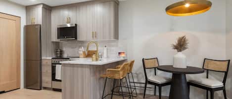 The modern interior and thoughtful design create a perfect retreat for couples or small families.