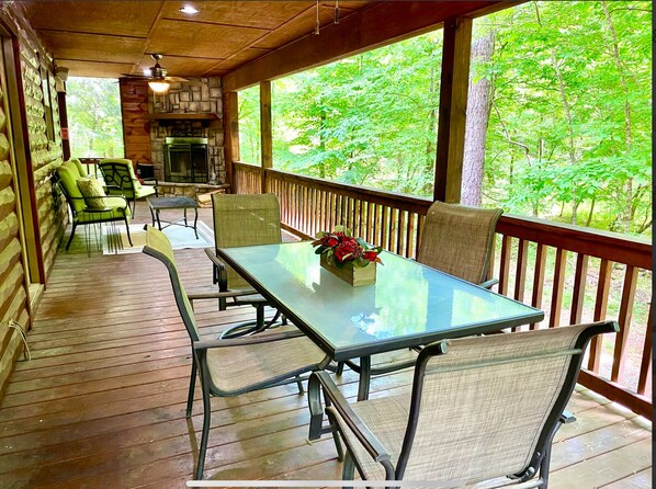 We loved our time at Nature’s Hideaway! It was very relaxing and the porch was amazing with all of the seating options, fireplace, and hot tub.