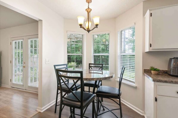It includes a fully stocked kitchen with a dining table inside and one on the back patio. It is centrally located in Brunswick, close to shopping and restaurants. There also is a desk for those that can work remotely, so you can work and still be a short drive to the beaches.