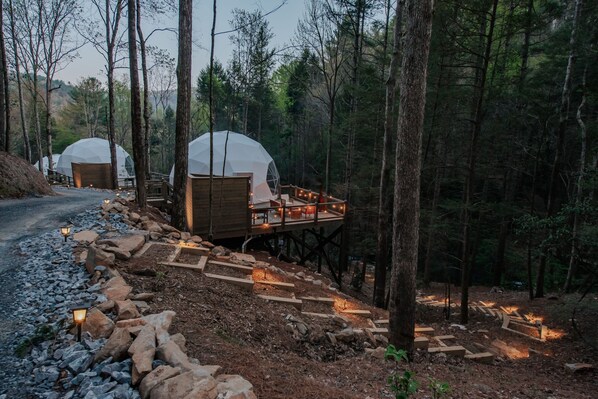 Located approx. 100 yards from the parking area and includes a small graveled hill. We provide a wagon that will be located at your parking spot to assist with luggage transportation. If you are able, the walk is absolutely worth it! But, if transporting luggage over this distance may be an issue, please consider Domes 5-7 that are located directly adjacent to the designated parking area.