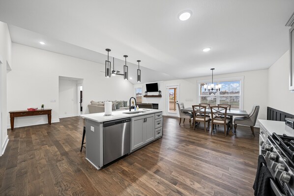 This spacious 1,570 sq. ft. retreat offers a cozy ambiance ideal for both relaxation and entertainment, making it perfect for families and groups alike. The home features a master bedroom with a luxurious King-sized bed, accompanied by two additional bedrooms, each furnished with comfortable Queen-sized beds, accommodating up to six guests. With two well-appointed bathrooms, morning routines are a breeze.