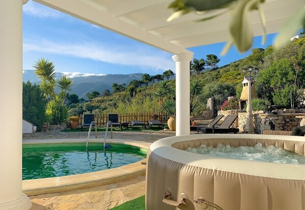 This vacation rental features a private outdoor area with a pool, whirlpool, garden, open terrace, covered terrace, barbecue, and outdoor shower.