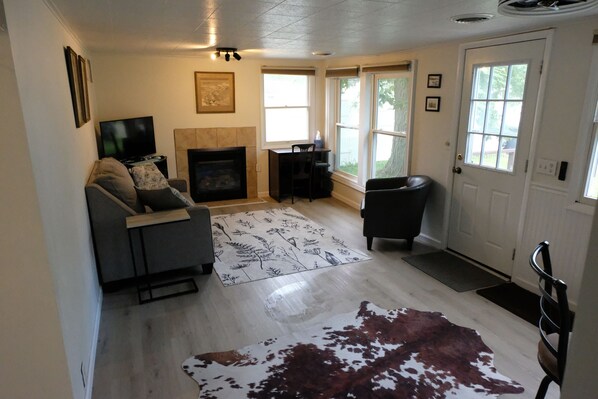 This Conesus cottage boasts 2 inviting bedrooms, featuring 1 queen bed and 1 twin bed. With a cozy atmosphere, a gas fireplace, private shared beach for swimming and lake access for small boat launching (no motor boats or jetski) and modern amenities like a hair dryer and AC, guests can relax and unwind. The bathroom is equipped with a shower and more essentials for a comfortable stay. Lots of private garden like outdoor space to grill and eat and a hammock. Our place is perfect for both long or short stays to make your vacation one to remember. Please note property does not provide WiFi or cable tv. Lots of cookware, bake ware and espresso/kcup maker and frother - no blender at moment (sorry it broke). Please note view of lake in picture is from the shared lake access, which is not directly across from the cabin, but about 500 ft a one minute walk down a gravel road from the front of the cabin. The cabin has glimpses of the lake but is across a dirt road from the lake, not directly on the lake front itself and there are houses across from it. The lake access is shared and requires a short walk, boats may not be tied to the dock and only hand carried boats can be launched from the shared area. great for swimming, kayaking or paddle boarding.
