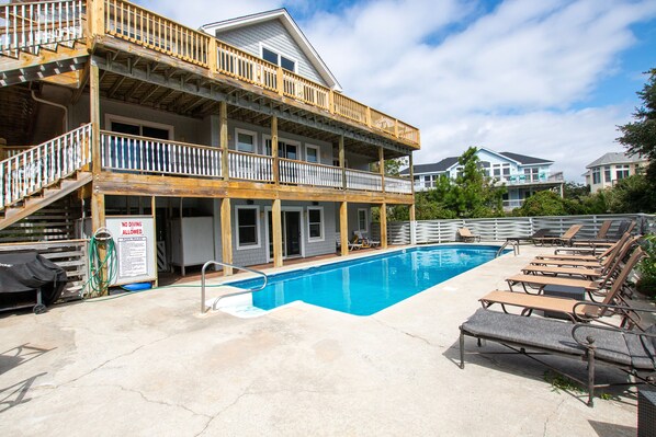 Extras: Private Pool (40 x 15), Hot Tub, 9 TVs, charcoal grill, pool table, kitchenette, Keurig, corn hole, high-speed wireless internet access, ocean views, 2 outside showers, community water and linens and towels provided. No Smoking. No Pets. Full week rentals only. House Address: 1219 Bismark Drive. Beds: 5 Kings, 4 DuoBunks. Distance to beach access: 989'. Key Type: Keyless Entry. CHECK IN LOCATION: 1023 Ocean Trail, Corolla Office.