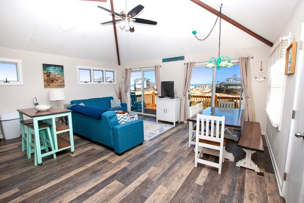 Top Level: Great room with ocean views, flat-screen TV, 2 Futon couches and deck access. Kitchen with stainless appliances, dining area seating 6 and a half bathroom.