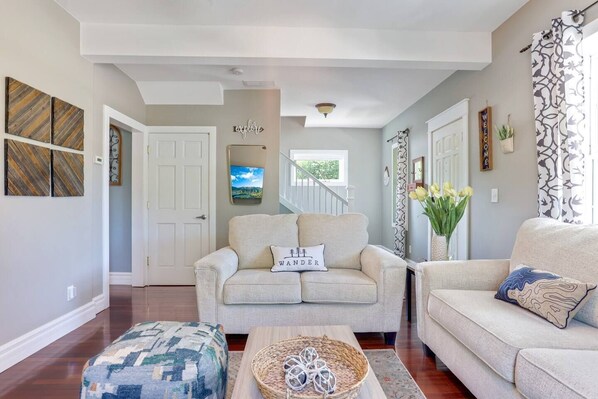 Home has an open concept main floor with comfortable living room and 65 inch smart TV with all your favorite apps, large dining room that comfortably seats 12 and a chef’s kitchen packed with appliances and tools.