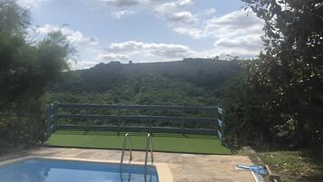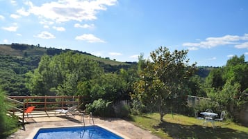cleanliness Seasonal outdoor pool in a peaceful rural retreat beckons with sun loungers and serene surroundings.