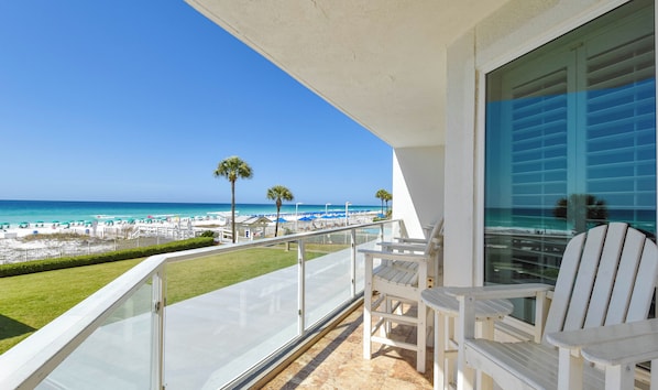 Sterling Sands 101 is a three-bedroom, three-bathroom, Gulf-front Condominium is situated right on the sugary, white sand beaches of the Gulf of Mexico. Sterling Sands 101 has a private Gulf-front balcony that is accessed through the Living Area and first primary bedroom through floor-to-ceiling windows and sliding glass doors. The living area and both bedrooms are equipped with flat-screen TVs.