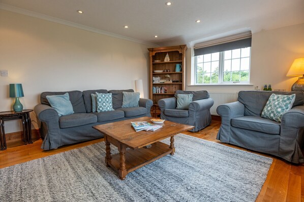 The main sitting room is on the first floor to make the most of the sea views across the fields onto Lligwy beach. The sitting room has comfy sofas and armchairs along with a smart TV and electric fireplace.