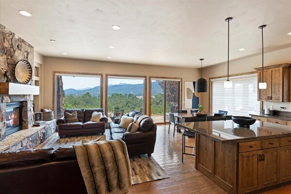 All set on one level, the main living space is anchored around a cozy gas fireplace surrounded by comfortable and modern furniture. This is the heart of the home and the place for gathering, taking in the latest blockbuster or football game. The fully stocked kitchen is adorned with solid wood flooring, bright white cabinetry, thick quartz countertops, a gas range, and a large dining room–all wrapped up in a wide open floor plan. The space is bathed with natural light coming in through the large picture windows. After adventuring in the mountains all day, spend the evening gazing across the valley while soaking in the hot tub on the back patio.