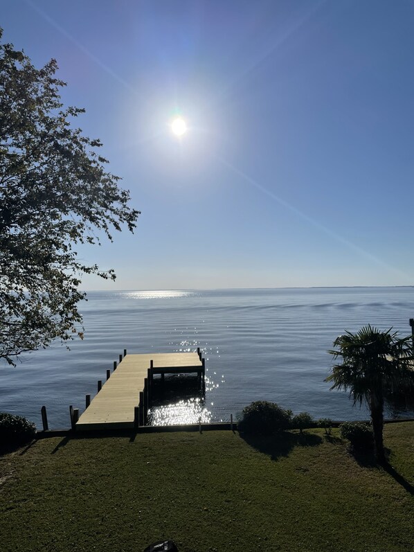 The views of the Albemarle Sound were even better than I believed possible! The view through the glass doors from the living room (and over the back deck) was truly breathtaking. We loved sitting on the wonderful sofa looking out on the water, watching tv, napping, and generally relaxing. We also loved the beautiful tree (maple?) surrounded by the deck, as well as the pier & dock. We loved the birds (martins?) swooping over the back yard and the fabulous sunsets over the water. The house was the perfect size for us and very comfortable. It was a delightful experience and many thanks to our hosts!