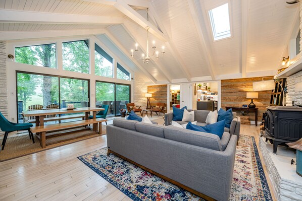 Welcome to Fairview Farmhouse, your private luxury mountain home nestled on five park-like acres. Step inside to a bright, modern space where 100-year-old hand-hewn Chestnut beams add historic charm. The main living room is perfect for relaxing by the Norwegian Jøtul wood-burning stove. The fully-equipped gourmet kitchen features a KitchenAid stainless steel gas stove and everything you need to prepare delicious meals, which you can enjoy at the dining table with seating for eight.