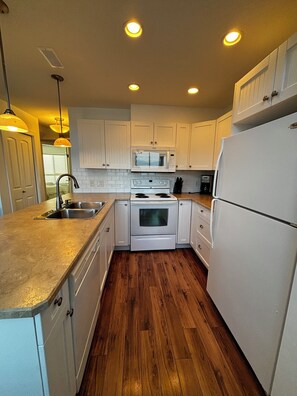 Entry (2 steps up) features an open kitchen, living, dining area with sofa bed, 2 queen bedrooms, and full bath.