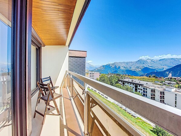 1-room apartment 32 m2 on 3rd floor, south facing position. Simple furnishings: living/dining room with curtain with 1 x 2 bunk beds (80 cm, length 190 cm), TV and DVD. Exit to the balcony, south facing position. Alcove with curtain with 1 french bed (140 cm, length 200 cm), electric shutters. Exit to the balcony, south facing position. Small kitchen (dishwasher, 2 induction hot plates, toaster, kettle, microwave, electric coffee machine, fondue Set (cheese)). Bathroom, sep. WC. Heating. Carpet. Large balcony 6 m2, south facing position. Beautiful view of the mountains and the resort. Facilities: hair dryer. Internet (WiFi, extra). Please note: non-smokers only. Smoke alarm. Instead of an enclosed bedroom, some sleeping areas are located in an open-plan area (gallery, alcove, etc.). Offer by a private individual according to  Art. 155, IV of CGI.