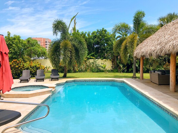 Large tiki hut and BBQ Grill. Multiple sitting throughout the pool area with smart flat screen TV ready for your relaxation and entertaining.