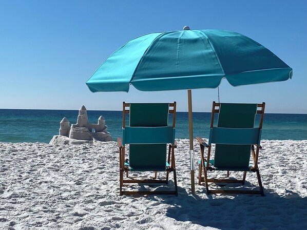 The complex has just 27 units. Our beach is uncrowded. Two beach chairs and a beach umbrella are set up each day between March 1 and October 31, at no charge to our guests. Enjoy a long walk on the pristine white sand beach next to emerald waters. Build a sandcastle, read a book, or rent a kayak on premise.