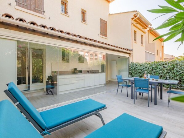 3-room apartment 42 m2, on the upper ground floor, south-east facing position. Object suitable for 2 adults + 2 children. Bright, renovated in 2022, simple and comfortable furnishings: dining room with TV (flat screen), air conditioning. Exit to the terrace. 1 small room with 1 x 2 bunk beds (80 cm, length 190 cm). 1 room with panoramic window Dressing room with 1 french bed (1 x 140 cm, length 190 cm), fan. Open kitchen (oven, dishwasher, 3 induction hot plates, toaster, kettle, microwave, freezer, electric coffee machine). Exit to the terrace. Shower, sep. WC. Heating. Terrace 15 m2 partly roofed, east facing position terrace 23 m2, west facing position. Terrace furniture, deck chairs (2). Facilities: washing machine, dryer, iron, hair dryer. Internet (WiFi, free). Parking space n 21 (1 car). Please note: non-smokers only. Smoke alarm. Offer by a private individual according to  Art. 155, IV of CGI. QEFCSN