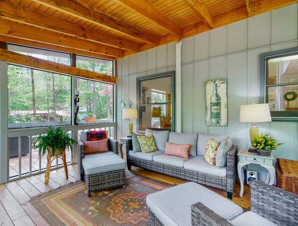 If you would like a cozy little pet-friendly cottage close to town, the Red Rooster Cabin is perfect! Located in the popular Mirror Lake area, the Red Rooster is only four minutes from town and yet on a remarkably quiet street. This home features everything you could want in a Highlands vacation: a new screened-in porch, a large deck, outdoor fire pit, and a large and totally fenced-in yard for your pet.
