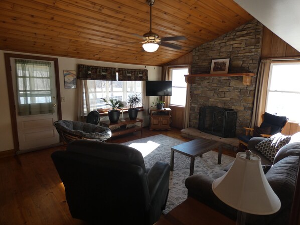 Small cabin with panoramic views of the New River. Large screen porch, great room, and kitchen all have river views. Large private yard areas with firepit. Private stairs with access to a large paved landing leading to the river. Just minutes from historic downtown Hinton and scenic Sandstone Falls. Recently updated kitchen.
