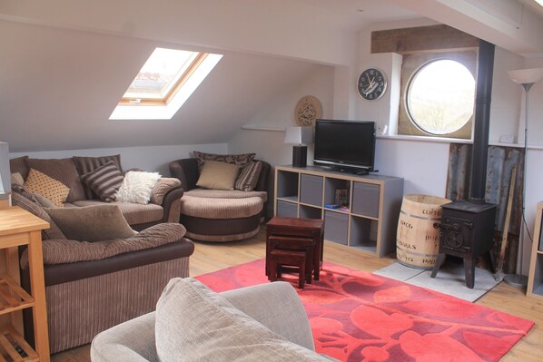 The Hayloft is all the space above our garage and stables building. There is a good size double bedroom with optional extra single bed. A cosy twin single bed room and an area that can be curtained off to use the double sofa bed. The key area is the 40 square metre main room which is communal living/dining /cooking area with a log burner and comfy couches and smart tv. The property is on a 3 acre plot with the main house with access to open fields and the Marsden Moor Estate on the doorstep. Have your breakfast out on the balcony and admire the views and spend evenings after a visit to the village in front of the log burner.