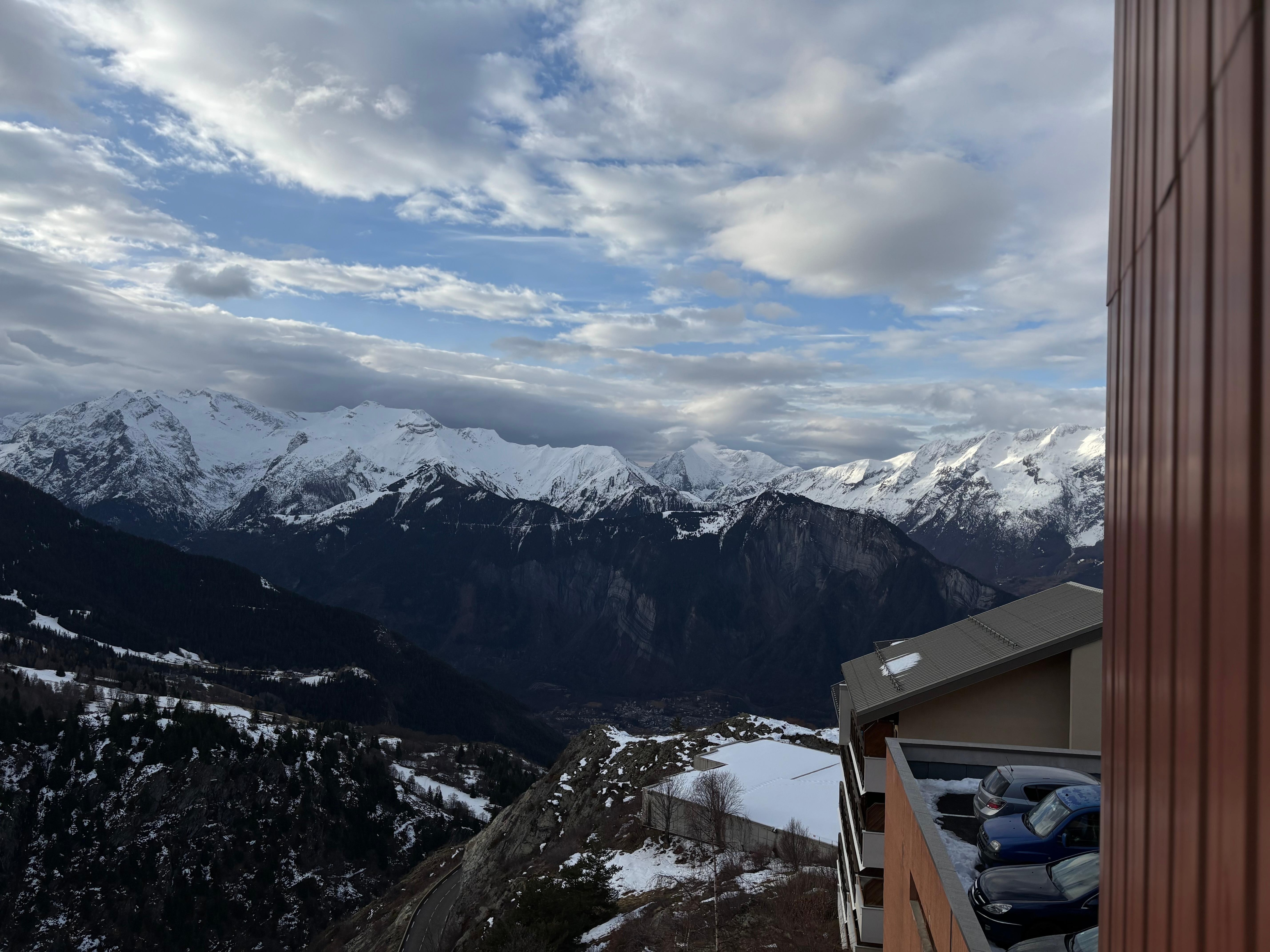 - a balcony with a beautiful mountain view,