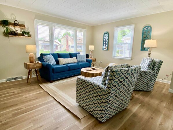 Our family of 7 enjoyed a 4 night stay. Our primary purpose was to spend 2 days at Cedar Point, and this location was a less than 20 minute drive (VERY easy). The house was clean, the beds were comfortable, the kitchen was well outfitted for preparing meals (dishes, pots/pans, utensils, etc.). Dining table matched the number of people the property can sleep so we could all eat at the table together. Bath and beach towels were both provided. There were chairs for sitting out front on the porch (under cover which was nice for when there was a rainy day) and out back. A/C worked well. Two highly rated restaurants, grocery store, drug store less than a mile away. Less than 5 min walk to private beach. In town (5+ min drive) there are more restaurants, bowling alley, fishing pier, ice cream shop, and opportunities to rent bikes & kayaks (which the weather, unfortunately, didn't permit us to do!). Property management very responsive. We would absolutely stay here again.