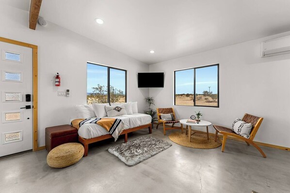 Welcome to Sunset Serenity—a cozy studio oasis on Hoover Street, Joshua Tree. This charming retreat is your gateway to tranquility, offering a perfect blend of comfort and style. Embrace the desert charm, unwind on the private patio, and stargaze beneath the desert sky. Only 5 Mins from shops and restaurants, and 10 mins from Joshua Tree National Park.
