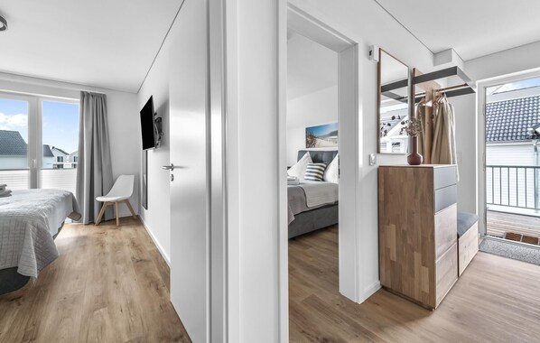 The designer bathroom is your very own private wellness area. A floor-level rain shower and an infrared sauna await you here. What could be better after a sunny day at the beach or a stormy walk?