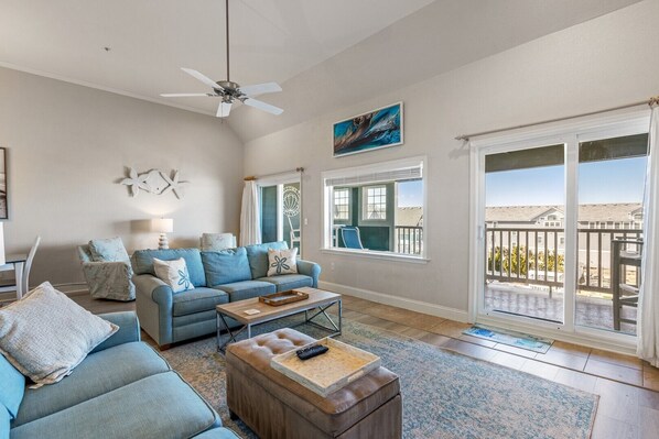 "Shell Yeah" is a 2 bedroom, 2 bath condo at First Flight Retreat with lots of recent updates! New mattresses and a new Lazy Boy for the living area. When you're not watching the ocean waves there's a 65" Ultra SmartTV in the living room and new TVs in the bedrooms. This spacious top-floor condo offers spectacular coastline views facing north from a large private balcony or the large living room picture window. Enjoy high vaulted ceilings with a dedicated working desk area for those of you working or schooling remotely! Open kitchen with a breakfast bar, including a Ninja gourmet coffee maker and Keurig, toaster & spice rack, brand new pots and pans, bakeware, dishes, and glassware. Shell Yeah has 2 queen bedrooms plus a queen sleeper sofa, accommodating up to 6 guests in the condo. Pet friendly(fee), beds made, washer/dryer in condo, WiFi, Roku SmartTV, and Echo Bluetooth speaker. This condo DOES NOT offer a storage unit.