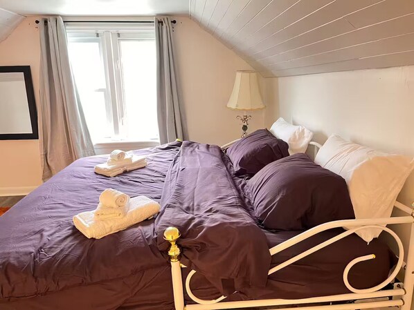 A cozy, classic bedroom with warm purple tones, soft bedding, and easy access to shared spaces.