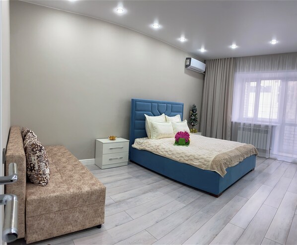 Al-Farabi apartment is located in the heart of Kostanay city. Stay connected with WiFi, indulge in SMART TV and savor a cup of coffee or tea, accompanied by sugar and salt.