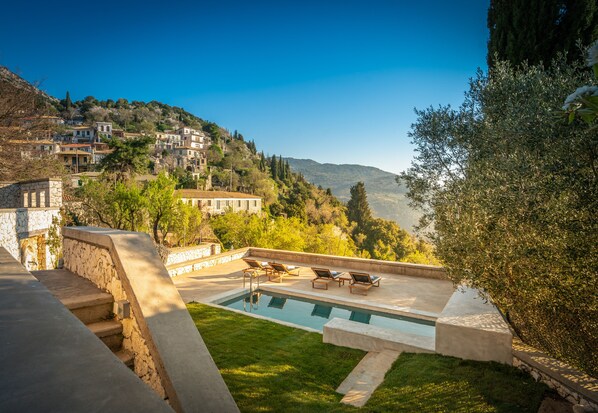 As for the outdoor area, there is no denying that it is absolutely delightful and charming! Mature trees and other lush vegetation decorate the grounds, creating a true sense of Mediterranean charm at its prime! This hand crafted, stone villa overlooks the slopes of Exanthia village and the Ionian Sea, soaking in the natural beauty of the area. A true delight for our guests to enjoy outdoor living during their stay.