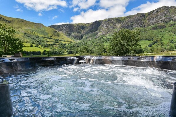 - Patio area with private hot tub for up to 8 people.