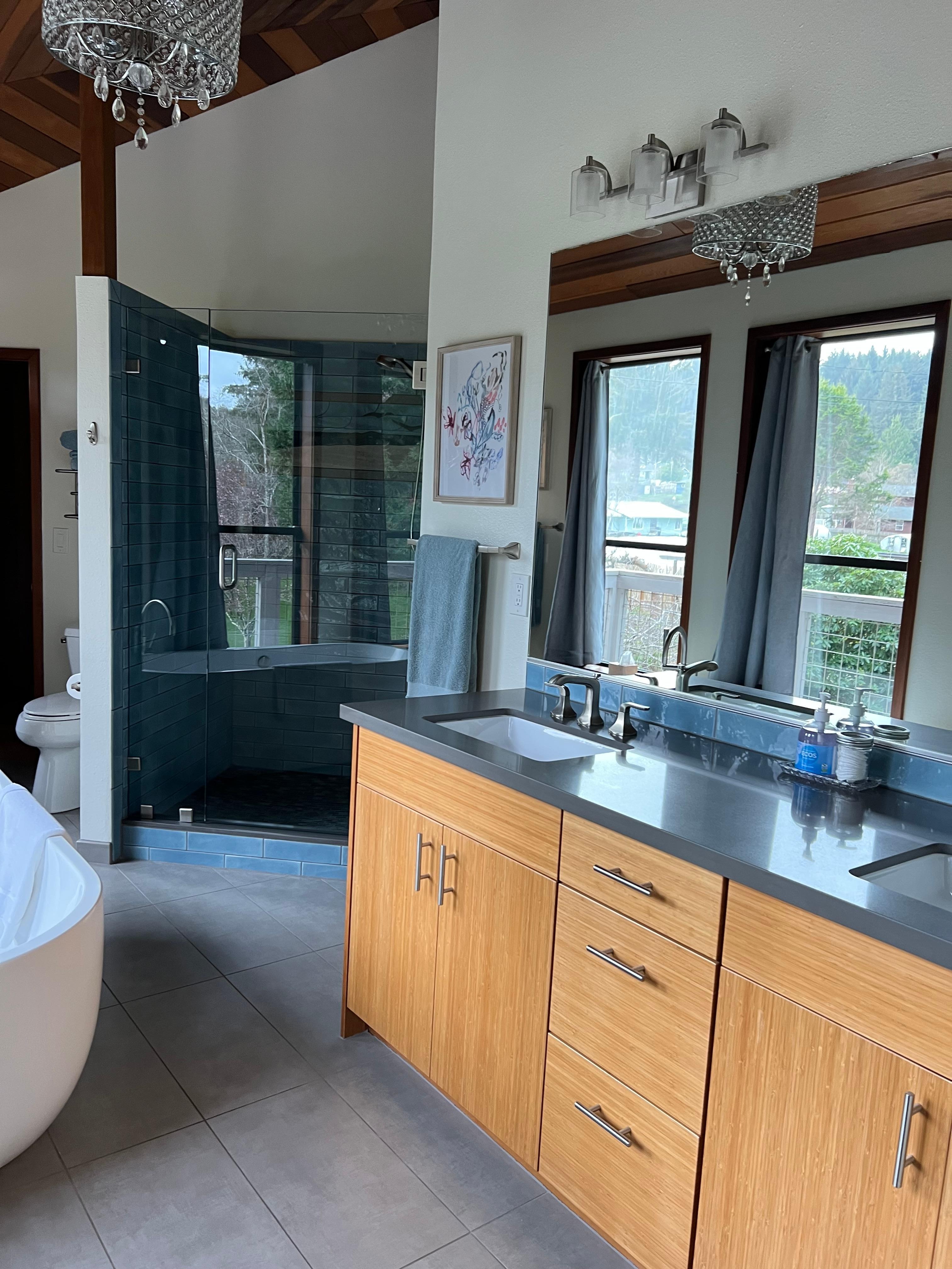 Melt into the large tub overlooking the yard, drink in hand, or head out to the hot tub on the deck next door. If you’re not a tub person, don’t worry, there’s a roomy tile shower.