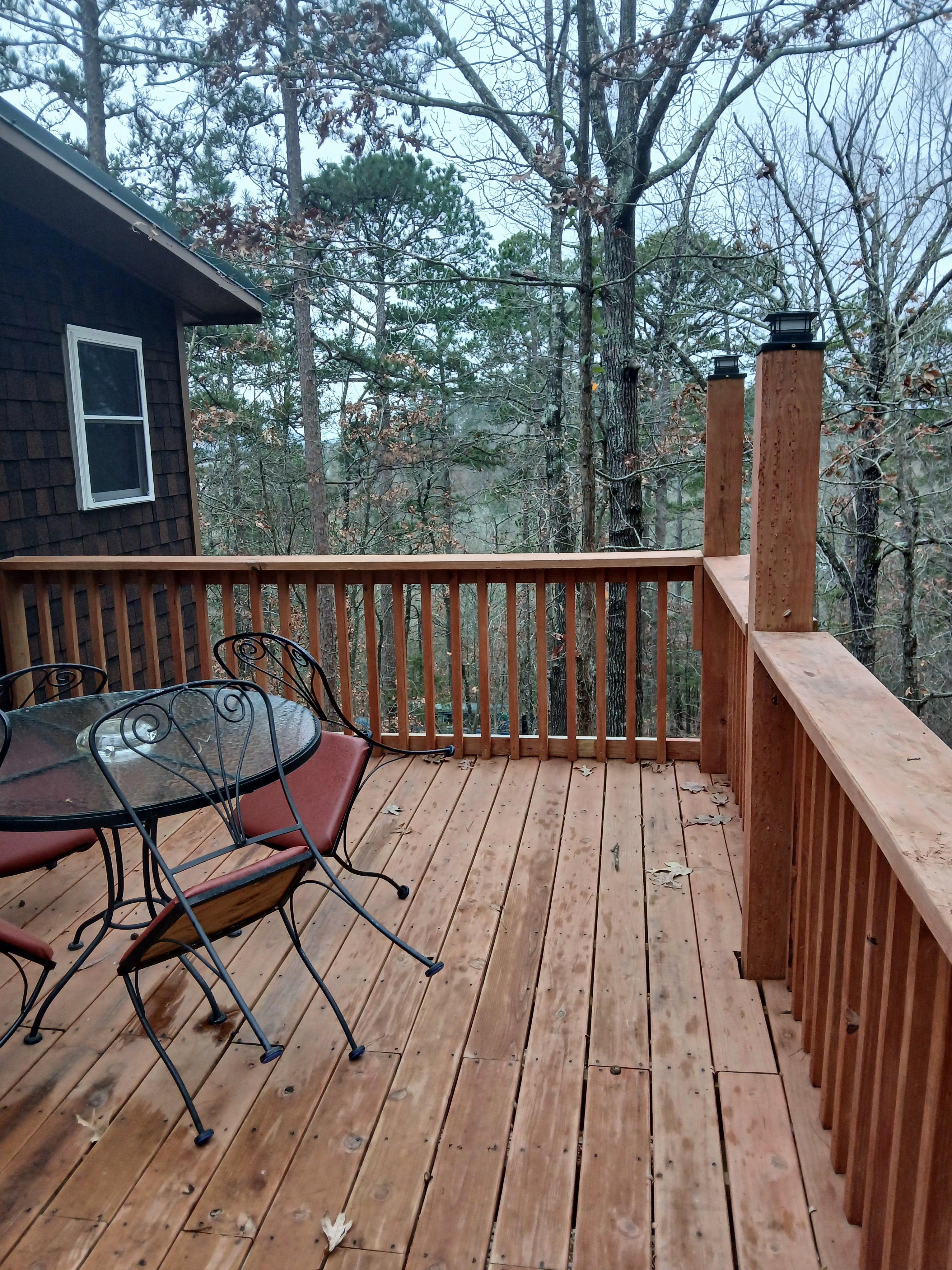 The cabin was very clean. Had everything you would need. The only thing I would add would be something for hanging clothes. Plenty of drawers for folded clothes. Be aware this time of year the acorns were falling and were loud when they hit the roof or deck. Woke me up. Very quite and peaceful other than that. Saw deer and squirrels.