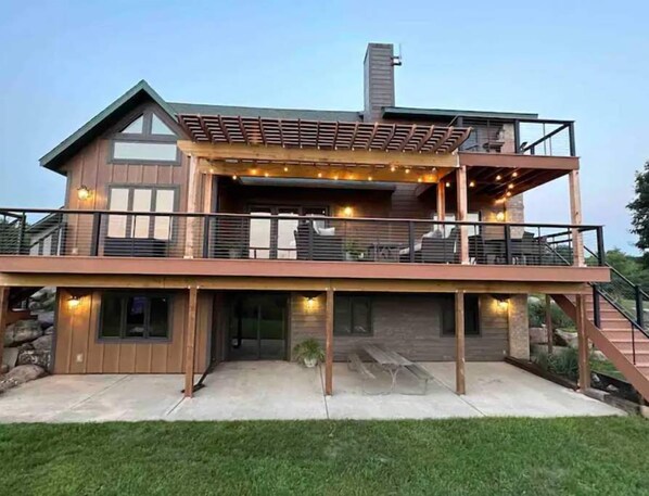 There are 5 beds and 4 baths (2 full, 2 half). The house has three levels. The main level has the kitchen, a family room with fireplace (wood is included!), master bed (1 king), master bath (two-person tub and shower), powder room, laundry, and access to the outdoor deck. The lower level has a bar gathering area, and two bedrooms (1 queen, 2 single beds). The upper level has a lofted sleeping area (1 queen), a powder room, and a game room with a flat table (suitable for a workspace and/or table games) as well as pool and ping pong tables. Outdoors is a propane grill and a wood firepit as well as the miles of trails to explore.