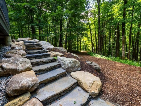 The main floor is ideal for group gatherings with a large foyer, a recently remodeled kitchen, a screened-in patio with a cozy breakfast table, separate dining room, and a spectacular living room with a fireplace, books galore, and stunning views of the forest and mountains beyond.
