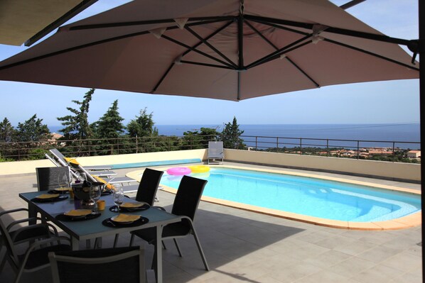 - A large dining room / living room of 50 m² with large windows overlooking the terrace and pool and view of Ile Rousse.