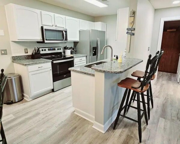 Three elegantly furnished bedrooms ensure a serene rest. The master suite delights with a plush king-size bed, a bathroom boasting both a tub and a shower, and a walk-in closet. The secondary bedroom offers a snug queen-size bed, while the third presents twin beds. Venture into a radiant open living space, thoughtfully updated with modern flooring, countertops, paint, and more. An electric fireplace enriches the living area, casting a warm and inviting ambiance. For culinary enthusiasts or cocktail aficionados, the recently renovated kitchen showcases brand new appliances, generous storage, cocktail barware and a coffee station featuring both Nespresso and Keurig machines. A utility closet brims with beach necessities, from tennis rackets to beach chairs. Also, we have a highchair & a travel crib/changing station/bassinette combination, per request. For added ease, the condo encompasses a washer, dryer, and is replete with linens, towels, and indispensable toiletries.