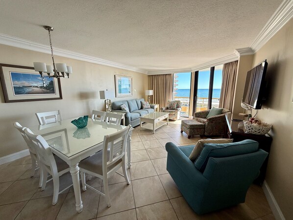 Welcome to Ocean Creek Resort and C9. Our totally remodeled 3BR/3BA condo is located on the 9th floor in the North Towr with a gorgeous, direct oceanfront view from our super large balcony. All new sliding glass doors were installed in 2017. Our condo has been completely remodeled to include a stunning kitchen with new cabinetry, granite countertops, tray ceiling and stainless steel appliances. The kitchen is fully stocked with dinnerware, cookware, and utensils. New dining room set with seating for six 2023. The oceanfront living room has been professionally decorated with custom drapes, all new furniture including a queen size sleeper sofa, 55" Smart wall mounted LCD TV with Blue Ray DVD player, ample seating and a panoramic view of the Atlantic Ocean. All living areas have been newly tiled, heavy crown molding throughout, and all bedrooms have new Luxury Vinyl Plank Flooring (2024). The oceanfront master bedroom with wall to wall sliding glass doors offers direct access to the front balcony. Master bedroom features a king size bed w/new mattress 2024, 37' wall mounted LCD TV, and adjoining bath with walk-in closet. The master bath has been completely remodeled with an extra large, artistically tiled shower, granite double vanity sinks, and new cabinetry. Guest bedroom #1 has a queen size bed with new mattress 2024, wall mounted LCD TV, and adjoining full bath. The guest bath has new, tiled shower, granite vanity and new cabinetry. Guest bedroom #2 features two twin beds with new mattresses 2024, wall mounted LCD TV, and adjoining full bath. This bath has also been remodeled with fully tiled shower, granite tops and new cabinetry. Other upgrades include all new doors and hardware, ceiling fans, new trim and lighting throughout. Full size washer/dryer in the hall.