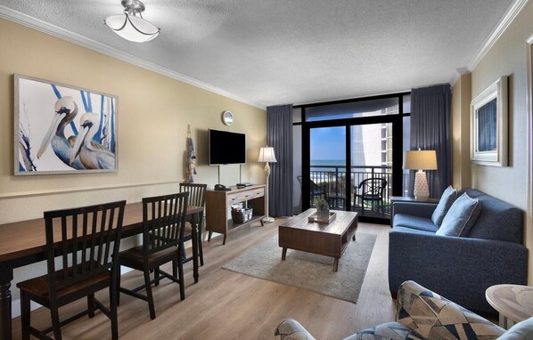 Our Angle Ocean View One Bedroom Condos are equipped with two double beds and a full-sized wall bed and sleeper sofa in the living room. The bedroom and living room have their own televisions and access to the full bath. They also have a stackable washer and dryer. The living room has a private angle ocean view balcony. The kitchen is equipped with a dining table with four chairs and full-sized appliances including a microwave oven, a coffee pot, a toaster, a stove, a garbage disposal, a dishwasher and a refrigerator with an ice maker. Basic cookware and dishware are provided along with an iron, an ironing board and a hairdryer. Wireless Internet access is available.